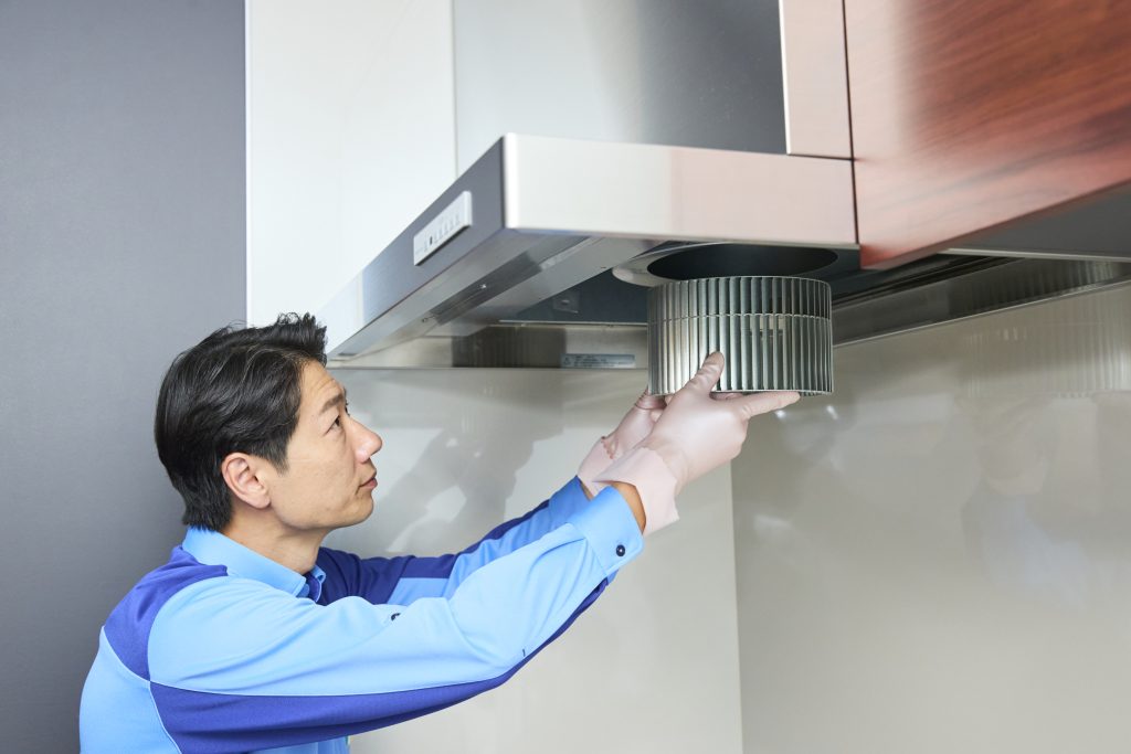 レンジフードのフィルターやファンのすみずみまでこびりついた、しつこい油汚れも逃さず、徹底的に分解洗浄してスッキリ。