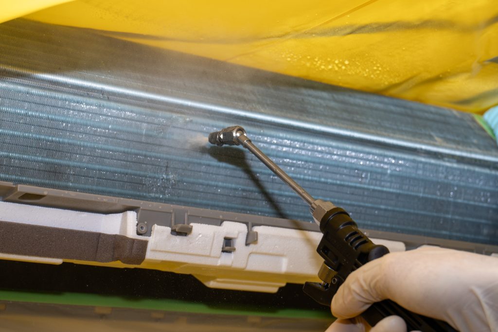 熱交換器の奥を専用資器材と薬剤で高圧洗浄。